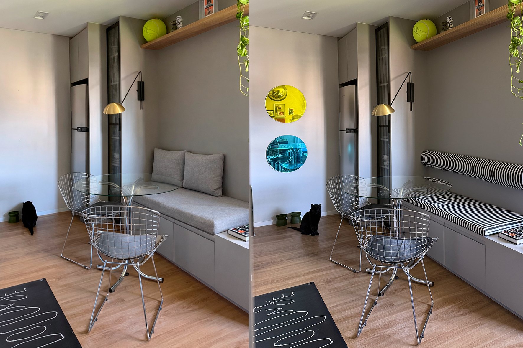 outro antes e depois! no mesmo apartamento, sugerimos preencher uma parede vazia com dois espelhos bola coloridos dispostos verticalmente e substituir o encosto do banco de jantar por uma cabeceira cátia em tecido listrado (aí fizemos o tecido do assento combinando também).