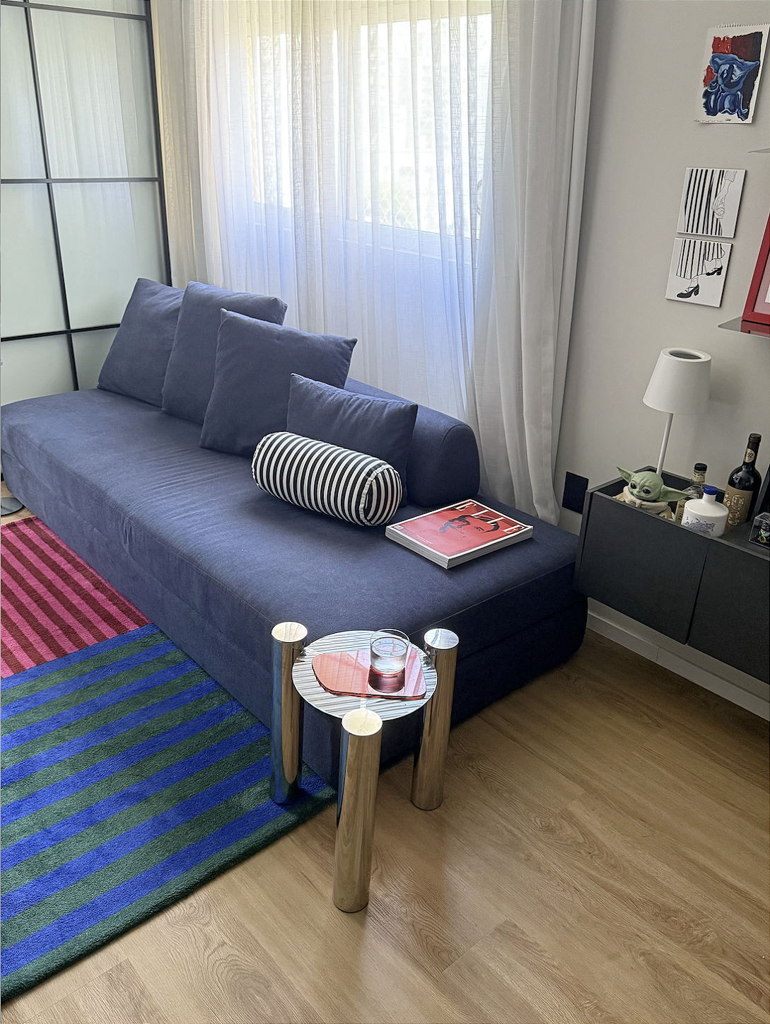 o que sugerimos aqui: tapete quarteto listrastico no chão, mesa lateral loren em inox com bandeja reta vermelha apoiada na extremidade do sofá, kit azulejo moderninha na parede e também fabricamos uma almofadinha listrada exclusivamente para esse projeto (podemos fazer pro seu também, tá?)